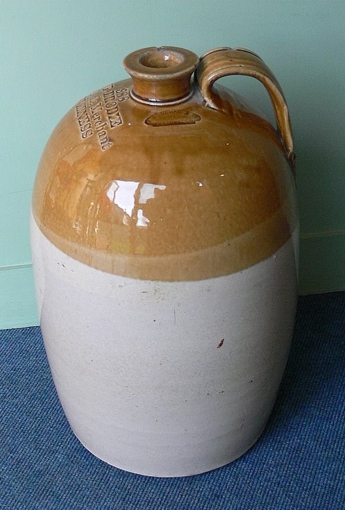Large earthenware whisky jar made by AW Buchan & Co at the Portobello Pottery. Shoulder is stamped "388 J.P. BRODIE Wholesale Merchant INVERNESS". A sticky label on the side (now removed) in Jimmy Bell's writing gave details of the donor and also said "Danny Leathad na Shermaig". Old display label states: "This jar belonged to the Matheson family of Lednashermaig, whose last surviving member, Danny, died around 1945. The family, in Lednashermaig for several generations, were well-known for illicit whisky distilling, commonly known as 'whisky smuggling'. Their bond stores were the peat bogs. Danny travelled the area every Friday evening carrying what looked like a boot box: it was commonly recognised that the box contained 2 bottles of whisky and that Danny was out supplying his customers. This piggin came into the possession of Johnnie Oman, Milltown of Evelix (uncle to John O. Sutherland), who took over the tenancy of Lednashermaig on the death of Danny. James Oman, farmer and meal miller at Milltown of Evelix (grandfather of John O. Sutherland), regularly prepared the malt for the Mathesons."