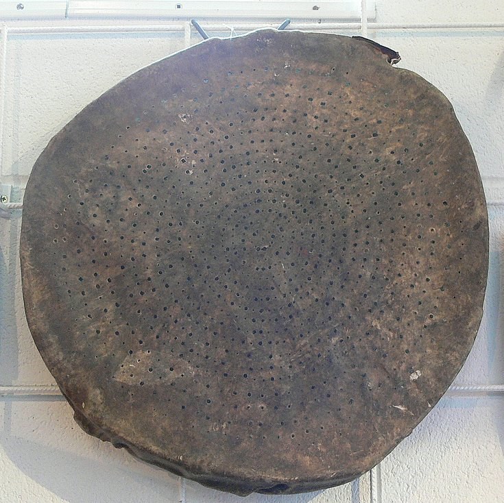 Riddle from the croft house at Dalaigh made from deer skin stretched over a bicycle wheel and pierced with concentric rings of holes.