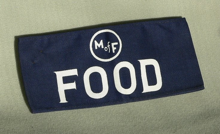 Two identical dark blue Ministry of Food armbands with white lettering 'MofF' enclosed in a circle and 'FOOD'. One armband is unused.