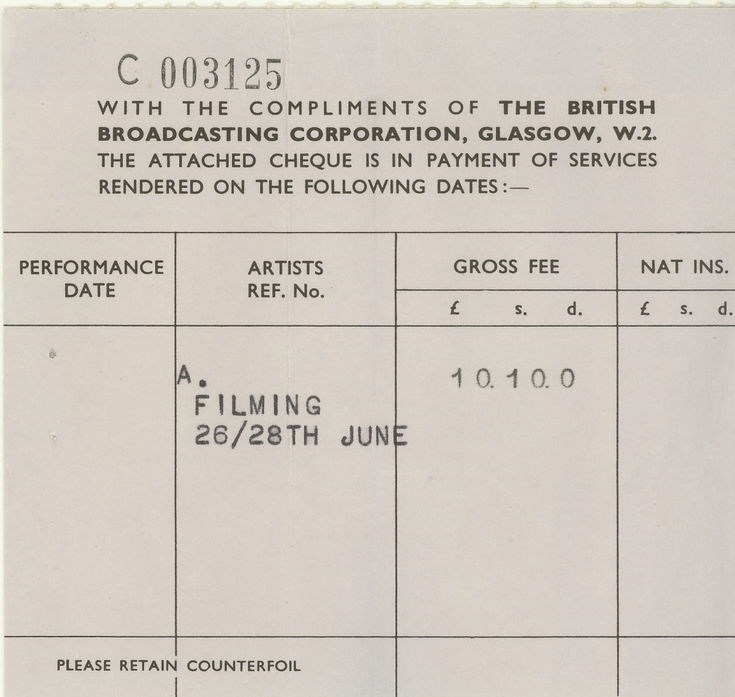 BBC Compliments slip accompanying cheque for £10.10, the gross fee for Robert McCulloch for the filming on 26/28th June 1969.
