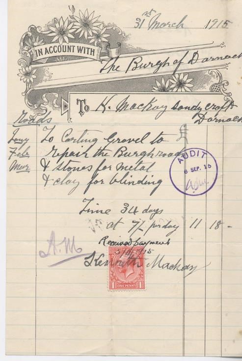 Bill from K Mackay, Sandycroft, for road materials, March 31st 1915.