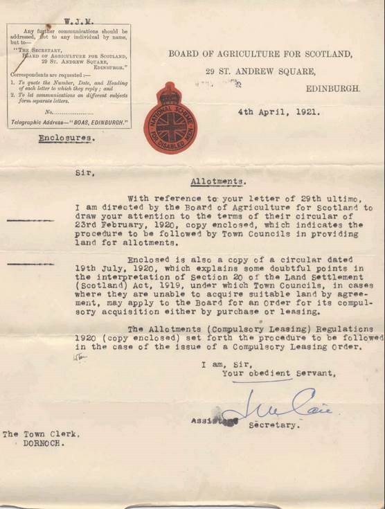 Letter from the Board of Agriculture for Scotland, enclosing procedures for Town Councils providing land for allotments, dated April 4th 1921. Three page circular pinned to letter (pin removed).