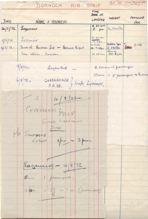 Manuscript local records of landings at Dornoch airstrip in 1972 (4 pages) including details of aircraft and passengers and, in the case of the Loganair documents the landing time, fuel on board and aircraft load distribution.