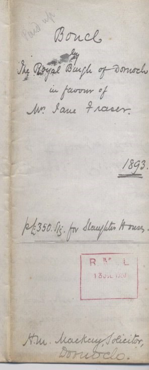 Bond by town council in favour of Jane Mackay or Fraser, High Street, Dornoch, dated November 30th 1893. Amount was £350, finally repaid in 1920. Sfs with complete burgh seal.