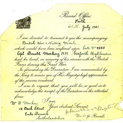 Pic 7149: Record Office Perth letter 1921 forwarding medals