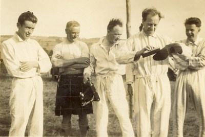 Pic 5214: Scouts at tea with camp fire shelter in background