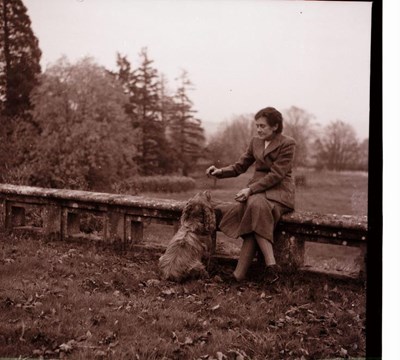 Pic 7254: A lady seated on a garden wall with dog